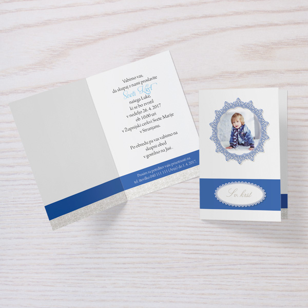 Vabilo za krst z okvirjem za fotografijo v modri barvi. Poljubno lahko prilagodite tekst na naslovnici in v notranjosti vabila. Vabilo 10x15cm - 1x zgibano.