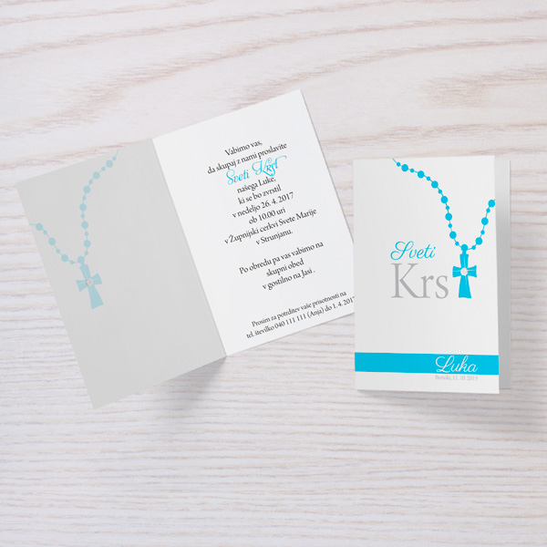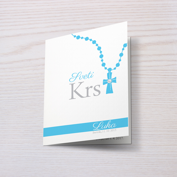 Vabilo za krst z grafiko križa v modri barvi.Poljubno lahko prilagodite tekst na naslovnici in v notranjosti vabila.Vabilo 10x15cm - 1x zgibano.
