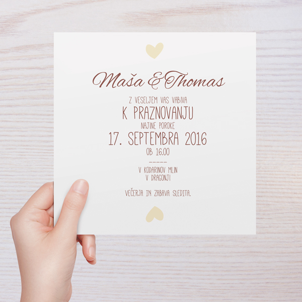 Vabilo je natisnjeno na mat 300g papir ali na 300g pearl papir, ki je nekoliko svetleč (izberete lahko pod okencem za tekst).