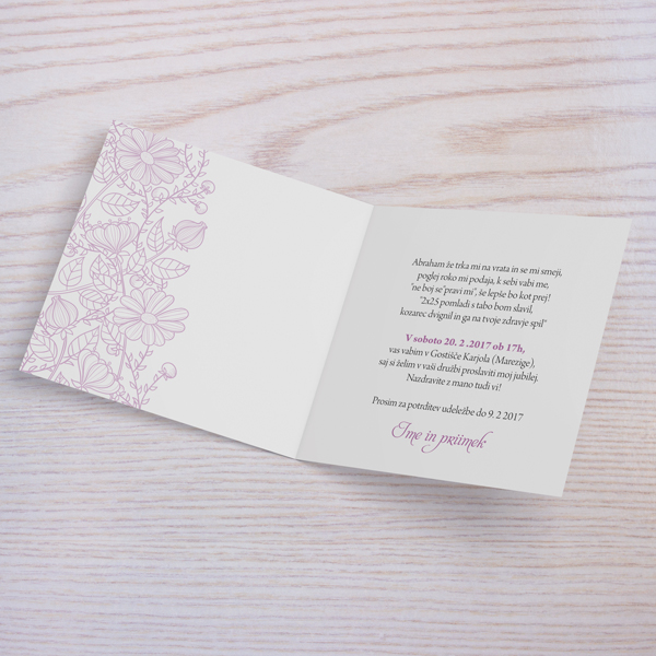 Vabilo z dodatkom bordure iz cvetov v vijolični barvi.Poljubno lahko prilagodite tekst na naslovnici in v notranjosti vabila.Vabilo 14x14cm - 1x zgibano