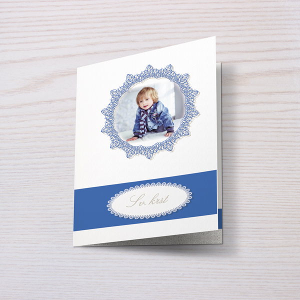 Vabilo za krst z okvirjem za fotografijo v modri barvi. Poljubno lahko prilagodite tekst na naslovnici in v notranjosti vabila. Vabilo 10x15cm - 1x zgibano.