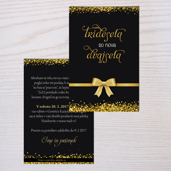 Vabilo glamur v zlati in črni barvi z bleščicami.Poljubno lahko prilagodite tekst.Vabilo 10x15 cm ali 15x20 cm.